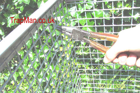 Flat pack fox trap only, lift the panel's and temporarily make the cage to size, turn the cage so that it stands vertically on the open end, position the end panel and locate the fixing tabs, fold these tabs and locate them in a mesh hole approximately two squares from the end of the cage, fold the end of the tab through the hole, bend and pull it with a pair of pliers, fix the others in the same way ensuring the trap remains "square"